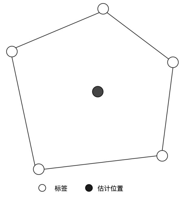 非测距方法是指前期搜集场景的信息,然后将获取到的目标与场景信息进行匹配,从而对目标进行定位。典型的实现方式是参考标签法和指纹定位法,其中参考标签法常用的算法是质心定位法,指纹定位法与Wi-Fi定位、Beacon定位等技术中采用的基本相同。质心定位法原理如Figure 4所示,在定位空间布置一些读写器,读写器的位置已知,当目标标签进入场景时,同时有多个读写器能够读到目标标签信息,这些读写器的位置和连线组成一个多边形,这个多边形的质心即可认为是目标标签的位置坐标。质心定位算法实现步骤简单且易操作,但是定位精度比较低,常用于对定位精度要求不高,硬件设备有限的场景。