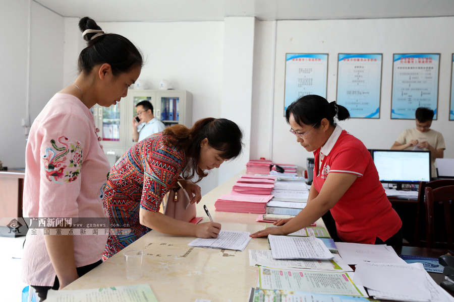 8月3日,在三江侗族自治县古宜镇南站社区人力资源和社会保障服务站,两名女子在咨询填写就业信息。广西新闻网通讯员 龚普康 摄