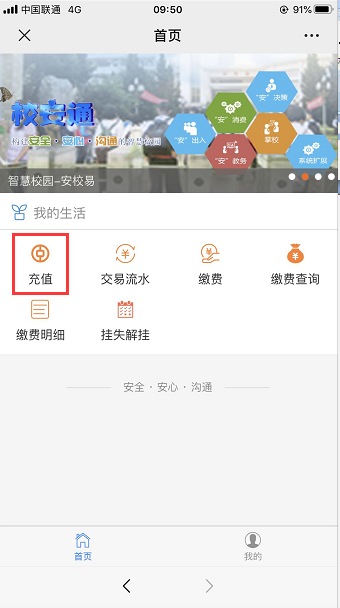 (1)点击首页中的“一卡通”,打开“首页”按钮进入充值