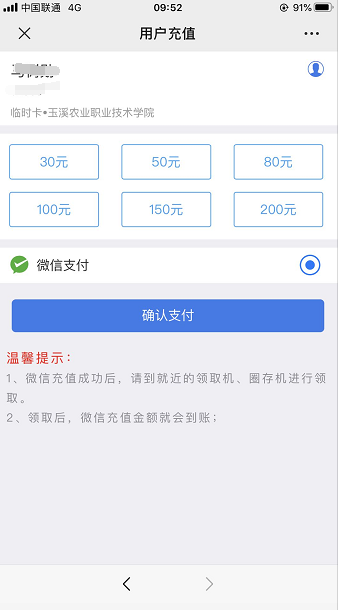 5、充值界面如下,选择金额以后,点击确认支付,输入密码,支付成功,到学校任意一台消费机或圈存机领取充值金额。(具体操作:把校园卡放到消费机上停留三秒,听到语音提示,领取成功;把校园卡放到圈存机读卡区,输入密码,按1号键,提示“领取金额”按确定,领取成功)
