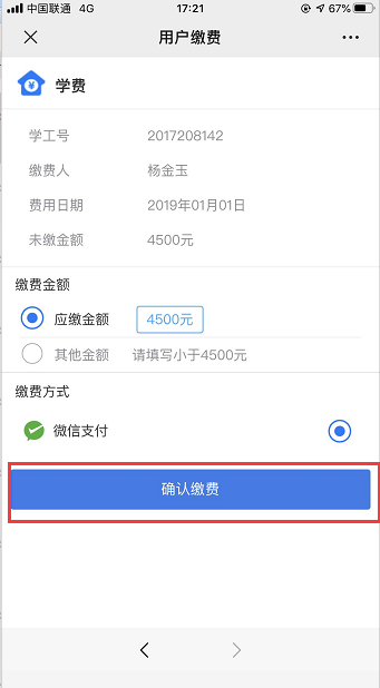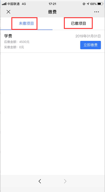 (1) 进入缴费界面,可以看到未缴的所有费用和已缴的费用。点击立即缴费,然后使用微信支付,输入密码,缴费成功。