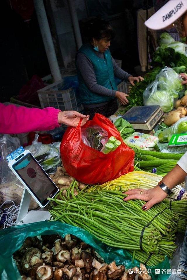 10月27日,济南民族商业街市场一家菜摊前,买菜的女士正在使用刷脸支付。最近商业街内的许多商家摊位,都新增了刷脸支付系统。