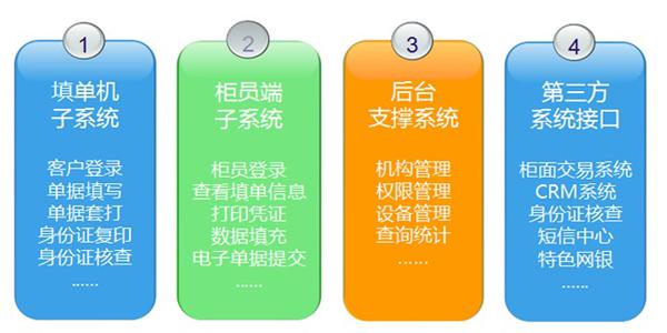 将原有手工填写单据转化为电子填单,客户预先填写的电子数据同时传输至银行柜面交易系统。